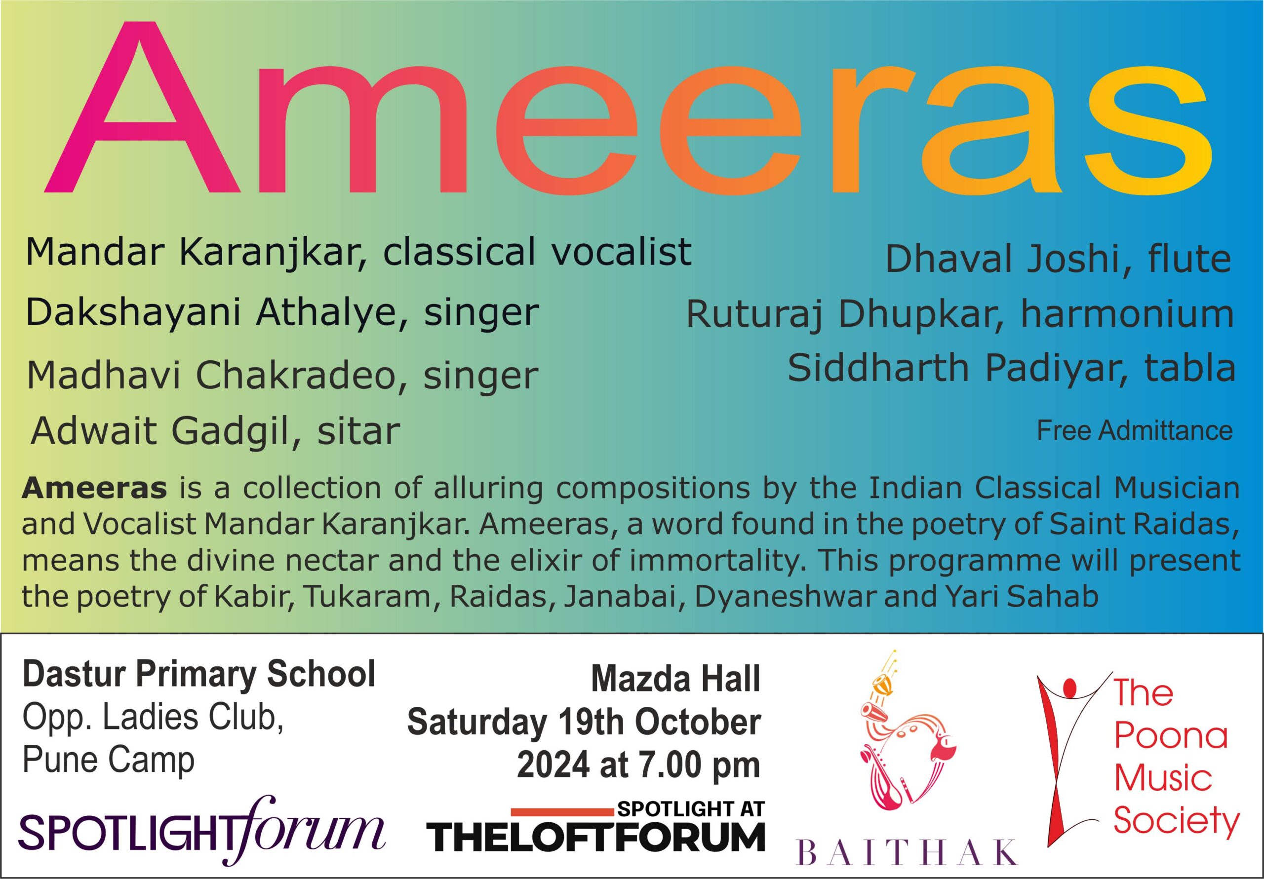 Ameeras is a collection of alluring compositions by the Indian Classical Musician and Vocalist Mandar Karanjkar. Deeply impacted by the uncanny expressions found in Indian mystic literature and poetry, Mandar has poured his heart into crafting this collection of compositional works that attempt to resonate with the enduring wisdom of the ages. Ameeras, a word found in the poetry of Saint Raidas, means the divine nectar and the elixir of immortality. By choosing this name for his collection, Mandar boldly champions the transformative power of these percipient words. The compositions become the medium, encouraging listeners to embark on the journey of unlocking the eternal within our mortal bodies.