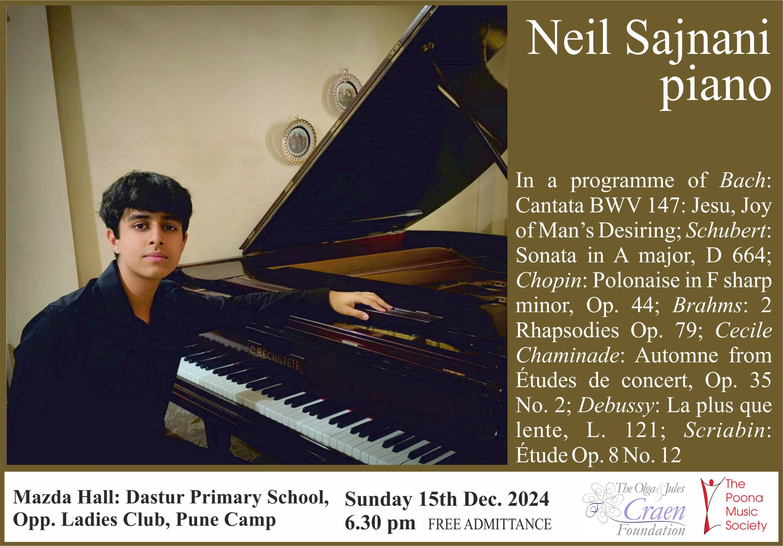 Neil Sajnani started the piano at the age of 6 and has been playing under the guidance of Ernavaz Bharucha for the last 11 years. Over the years, his passion for music, enthusiasm and dedication have grown tremendously. His first public performance was at the StopGaps Budding Brigade, and he went on to win ConBrio Open Piano Competition in 2023. He was selected as the Young Musician of the Year 2024 by the Olga and Jules Craen Foundation, under whose sponsorship he attended the International Summer Piano Academy in Disentis, Switzerland. Over there, he received masterclasses primarily from Sergei Edelmann and also received musical advice from Konstantin Scherbakov and Thomas Hecht.
