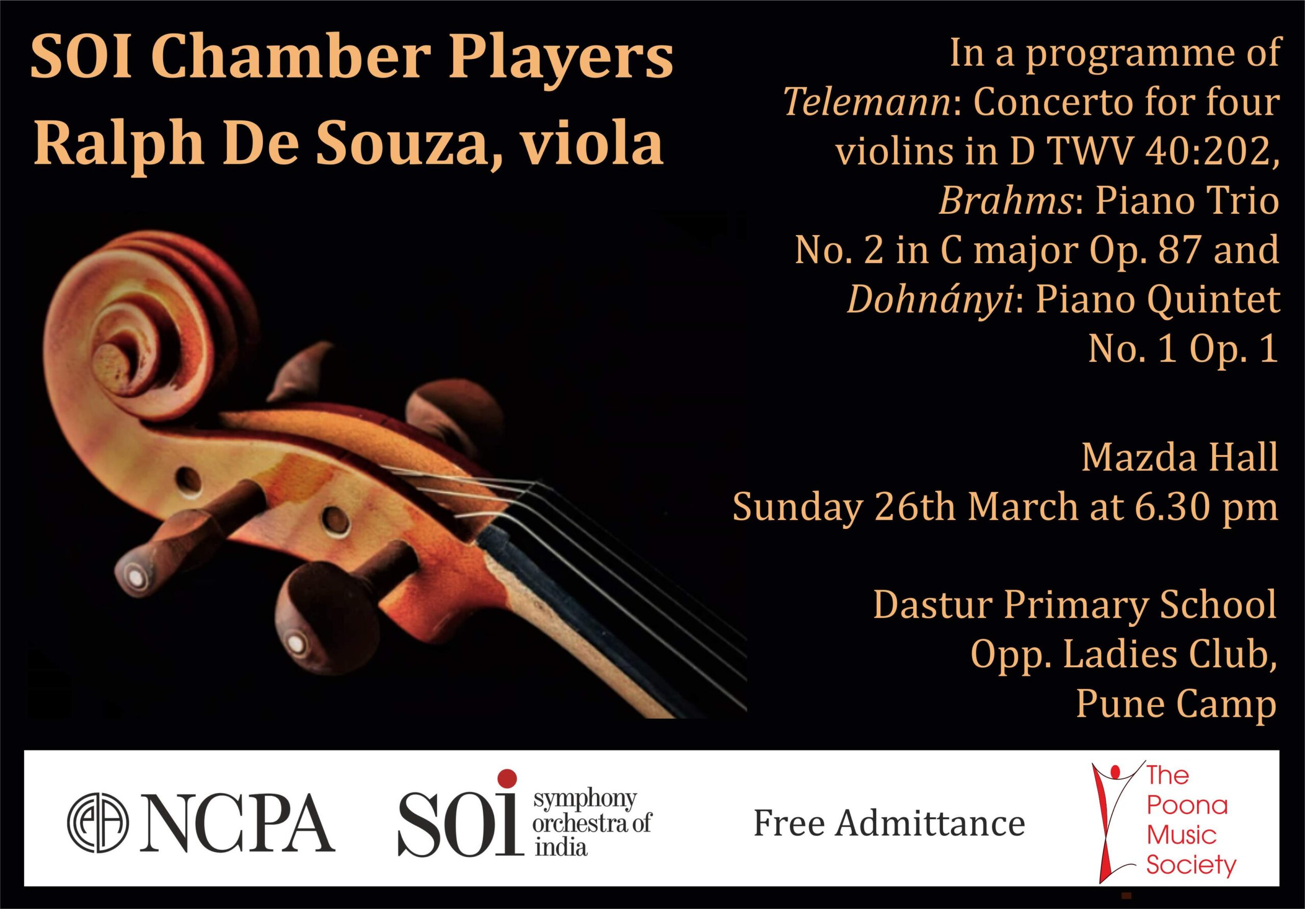 As an ongoing project, members of the SOI Chamber Orchestra have been working with Ralph De Souza to study chamber music repertoire. The SOI Chamber Orchestra forms the core of the Symphony Orchestra of India which is India’s first and only professional Symphony Orchestra. Founded in 2006, by NCPA Chairman Khushroo N. Suntook and violin virtuoso Marat Bisengaliev, the orchestra has worked with such renowned conductors as Carlo Rizzi, Martyn Brabbins, Charles Dutoit, Yuri Simonov, Jacek Kaspszyk, Lior Shambadal, Rafael Payare, Adrian Leaper, Johannes Wildner, Duncan Ward, Karl Jenkins, Mischa Damev, Evgeny Bushkov, Alexander Anissimov, Christoph Poppen, and others. Soloists appearing with the SOI have included Maria João Pires, Augustin Dumay, Simon O’Neill, Cédric Tiberghien, Alina Ibragimova, Stephen Hough, Stephen Kovacevich, Barry Douglas, Angel Blue, Zakir Hussain, Béla Fleck, Tamás Vásáry, and Lena Neudauer, amongst others.