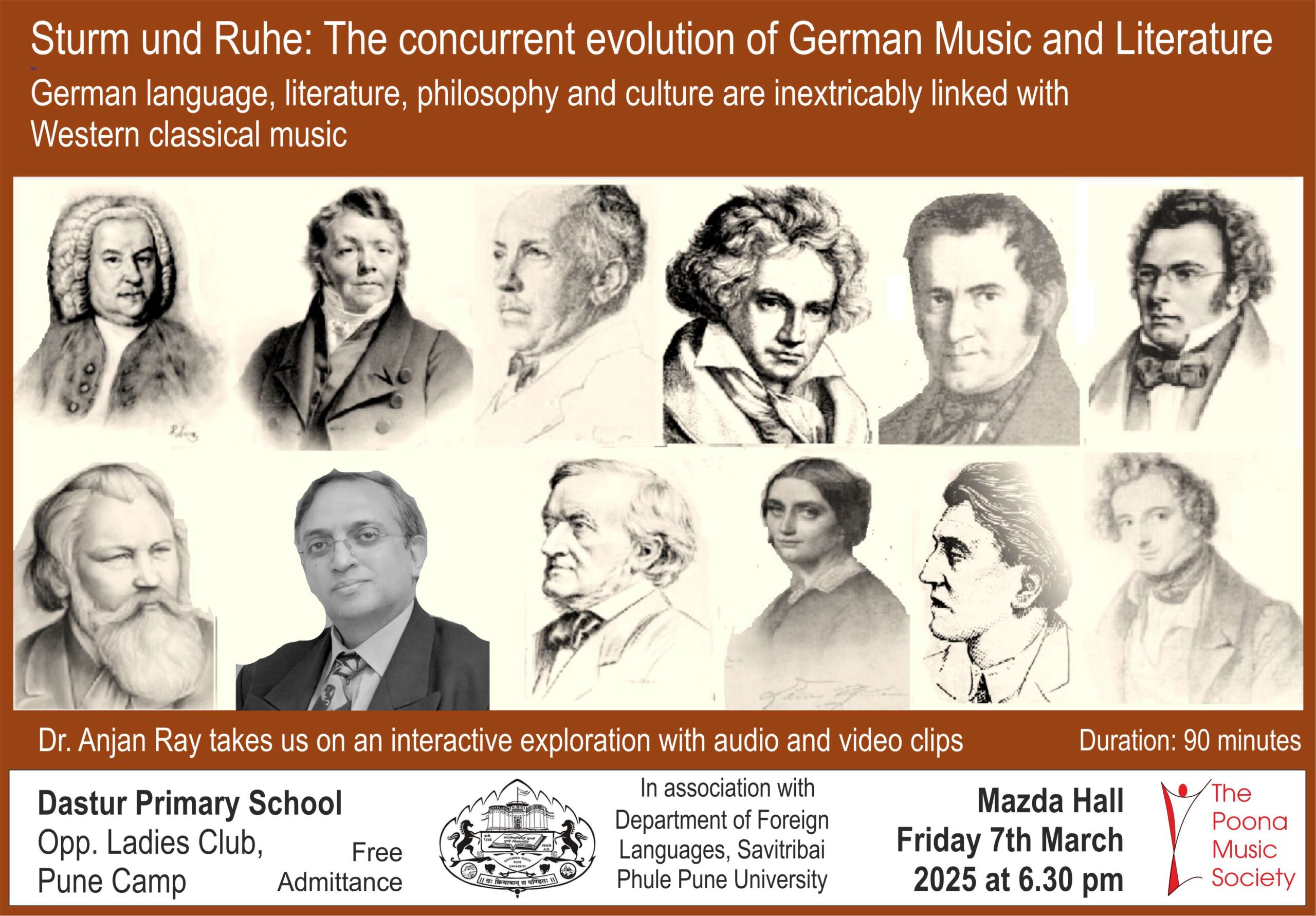 German language, literature, philosophy and culture are inextricably linked with Western classical music, especially from the mid-18th to the mid-20th century before popular recorded music became widely available and affordable. Join us for an interactive exploration of this evolution with students and faculty of German literature at Savitribai Phule University in association with The Poona Music Society. Anjan Ray, a multidisciplinary professional and former radio anchor, will moderate the session.