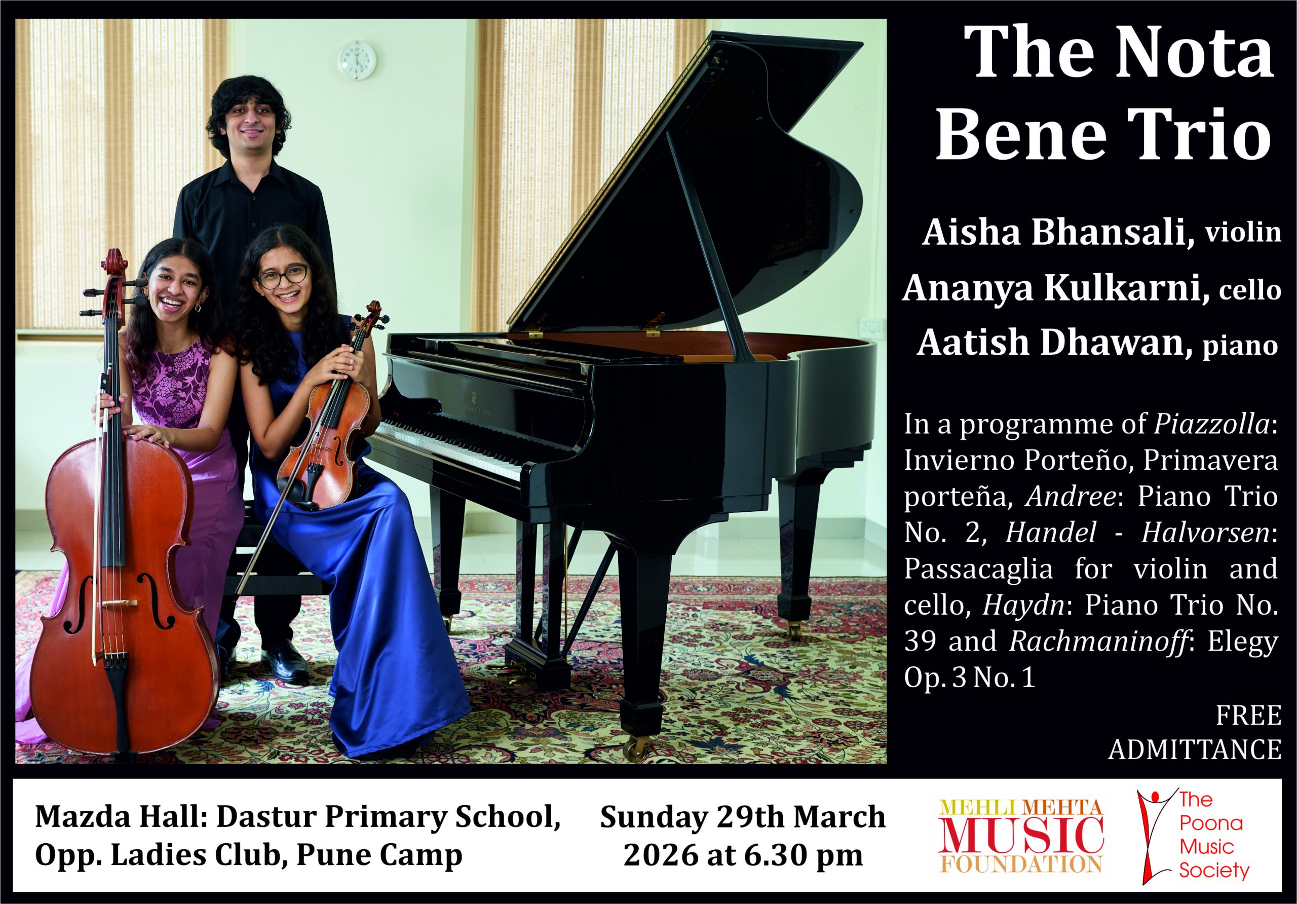 Three young students of the Mehli Mehta Music Foundation, passionate about music, started The Nota Bene Trio. The trio has performed with many renowned visiting artists at various venues in Mumbai, to much acclaim. They have been recognised for their ability to communicate with each other, and engage with the audience.